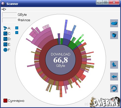 Scanner - программа для анализа содержимого жестких дисков, CD, дискет и других носителей: для начала показывает в виде наглядной диаграммы все папки и файлы, находящиеся в корне анализируемого диска, допуская после этого продвижение вглубь для получения сведений о содержимом под папок, а также отображает информацию о файлах и папках. Позволяет быстро удалить обнаруженные ненужные файлы и папки; работает без инсталляции; интерфейс - на том языке, который установлен в системе.