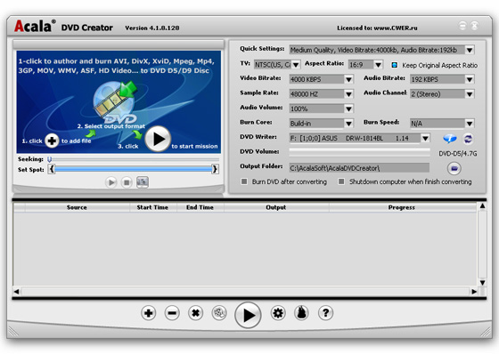 Acala DVD Creator - это простая в использовании, но мощная программа для DVD авторинга. Предназначен для тех, кто хочет наслаждаться просмотром фильмов на DVD-плеере. Вы можете конвертировать видео практически всех форматов, таких как AVI, DivX, XviD, MPEG, Mp4, 3GP, MOV, WMV, ASF, HD видео в DVD D5/D9 фильмы и записывать их на DVD.