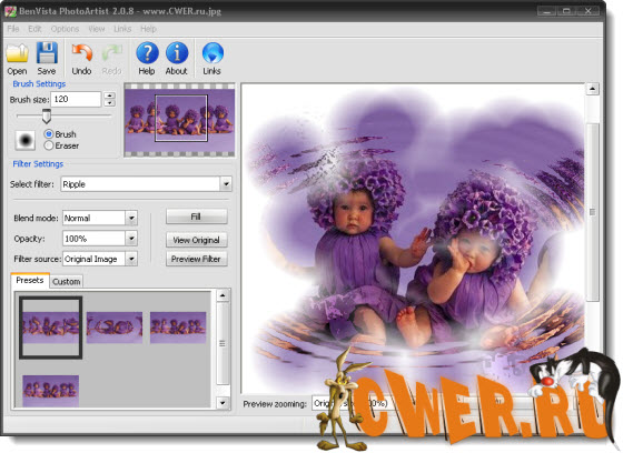 BenVista PhotoArtist - уникальная программа для творчества, которая позволит вам превратить фотографии в художественные произведения. С ее помощью можно создать на основе фотографии самую настоящую картину. Для преобразования фотографии в художественное произведение нужно выбрать один из фильтров в списке Filter Settings. Доступно огромное количество эффектов – от акварельной краски до мелков и карандашного наброска. Очень удобно то, что программа генерирует значки для предварительного просмотра эффектов на основе уже загруженной фотографии, что дает возможность примерно представить себе, каким будет результат. После выбора эффекта можно использовать кисть для проявления изображения в выбранной области. При этом, можно гибко управлять размером кисти и прозрачностью.